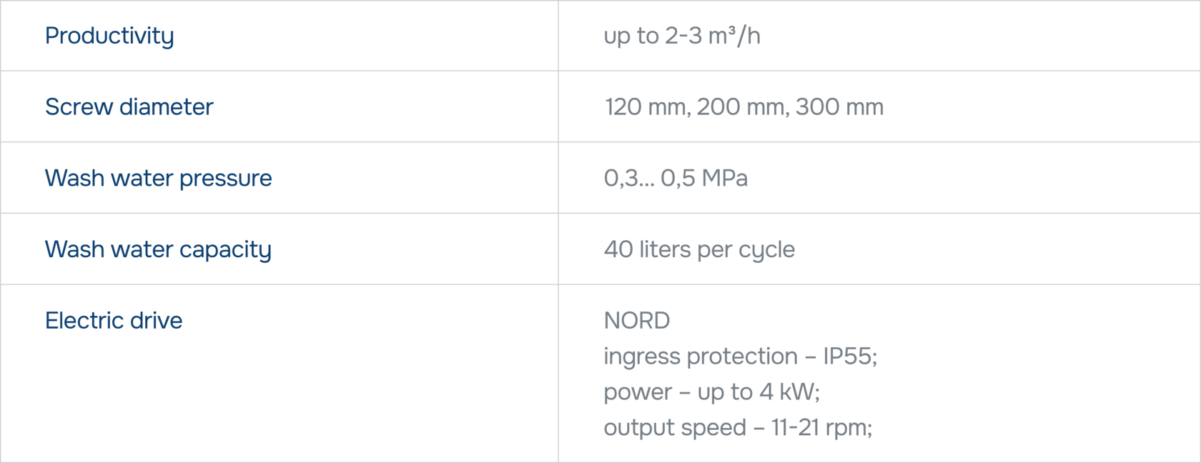 CONSTRUCTION: the press is designed as an independent equipment, the working body of which is a spiral rotating in a perforated housing. The waste through the feed hopper enters the press and is moved by the rotating spiral to the squeezing zone, where it is washed and compacted, after which it is fed to the discharge pipe.