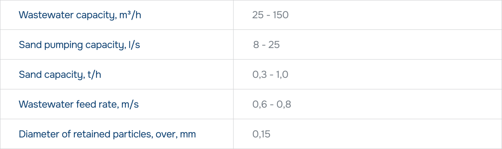 Grit chambers are intended for the extraction and removal of highly precipitable particles (grit), which are sized more than 0.15 mm from municipal and industrial wastewater. The grit chambers are intended for use in wastewater with a рН of 6.5 – 8.5.