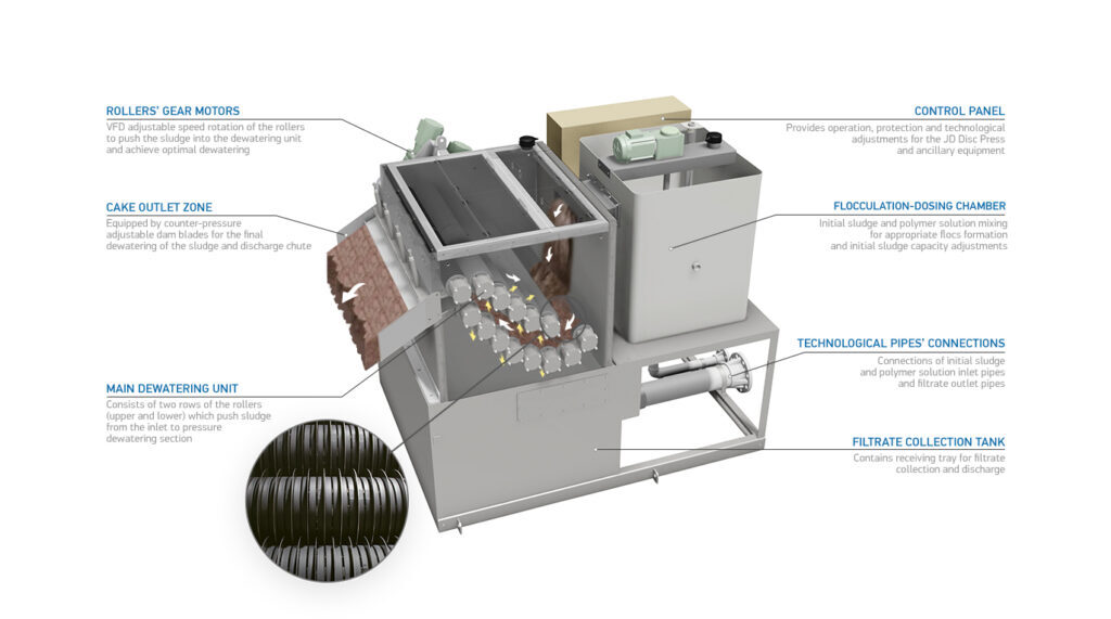 JD Disc Press is an optimal solution for mechanical dewatering of wastewater sludge with high mineral content from municipal treatment stations, industrial, agricultural and food enterprises