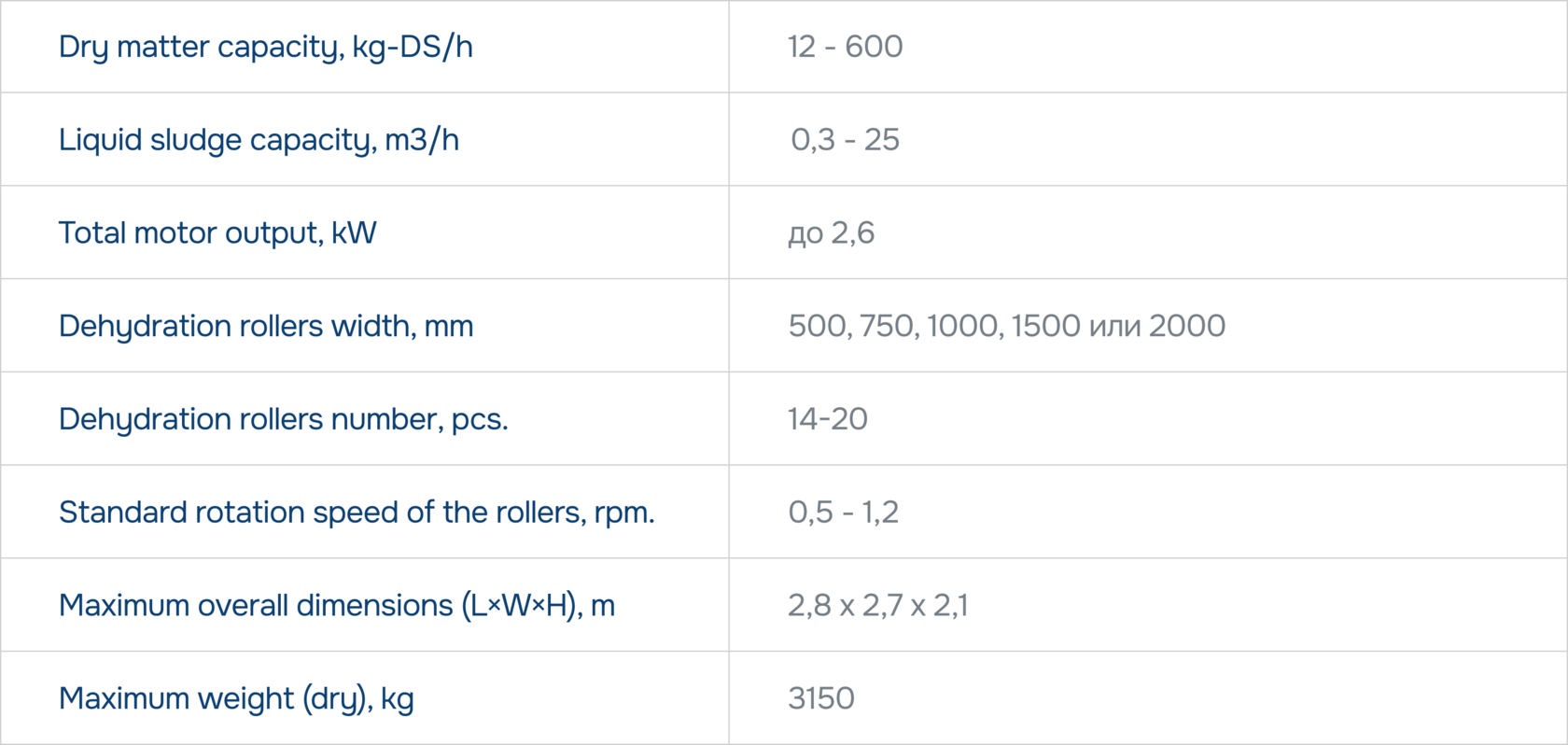 The distance between the rows of the upper and lower rollers is at least 50 mm, which allows working with sludge with large and fibrous inclusions without clogging the main dewatering unit with cake.
