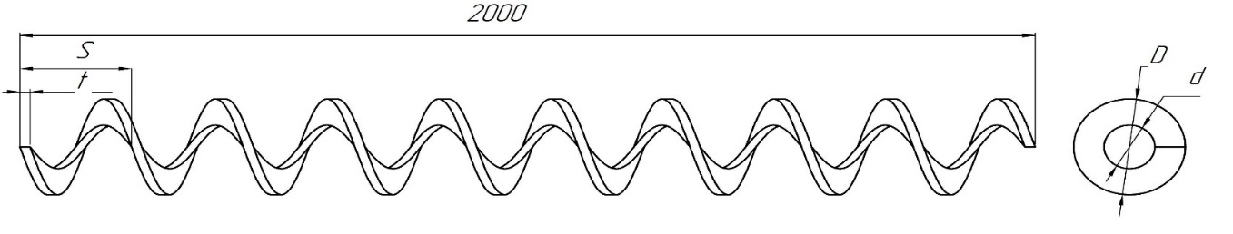 Axleless augers are produced by hot winding from a whole strip, rather than by manufacturing each turn separately, which is an undeniable advantage. The following materials are possible for manufacturing augers: Q345B, Aisi304, Aisi316. The maximum auger length is 2000 mm. Augers are supplied immediately with a double-sided cutting for welding at both ends, which ensures fusion and speeds up assembly to the length of the finished product you need. Maximum deviations in manufacturing: Step S 0+5 mm, Outer diameter D 0-2 mm.