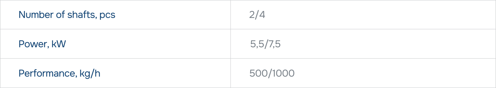 The grinder consists of two sets of rotary cutters installed in a housing. On top of the housing, there is a receiving hopper for feeding the waste for grinding. A slide is provided in the lower part of the housing for the directional discharge of the ground waste. Depending on the application, the grinder can be installed on a skid or a mounting frame.