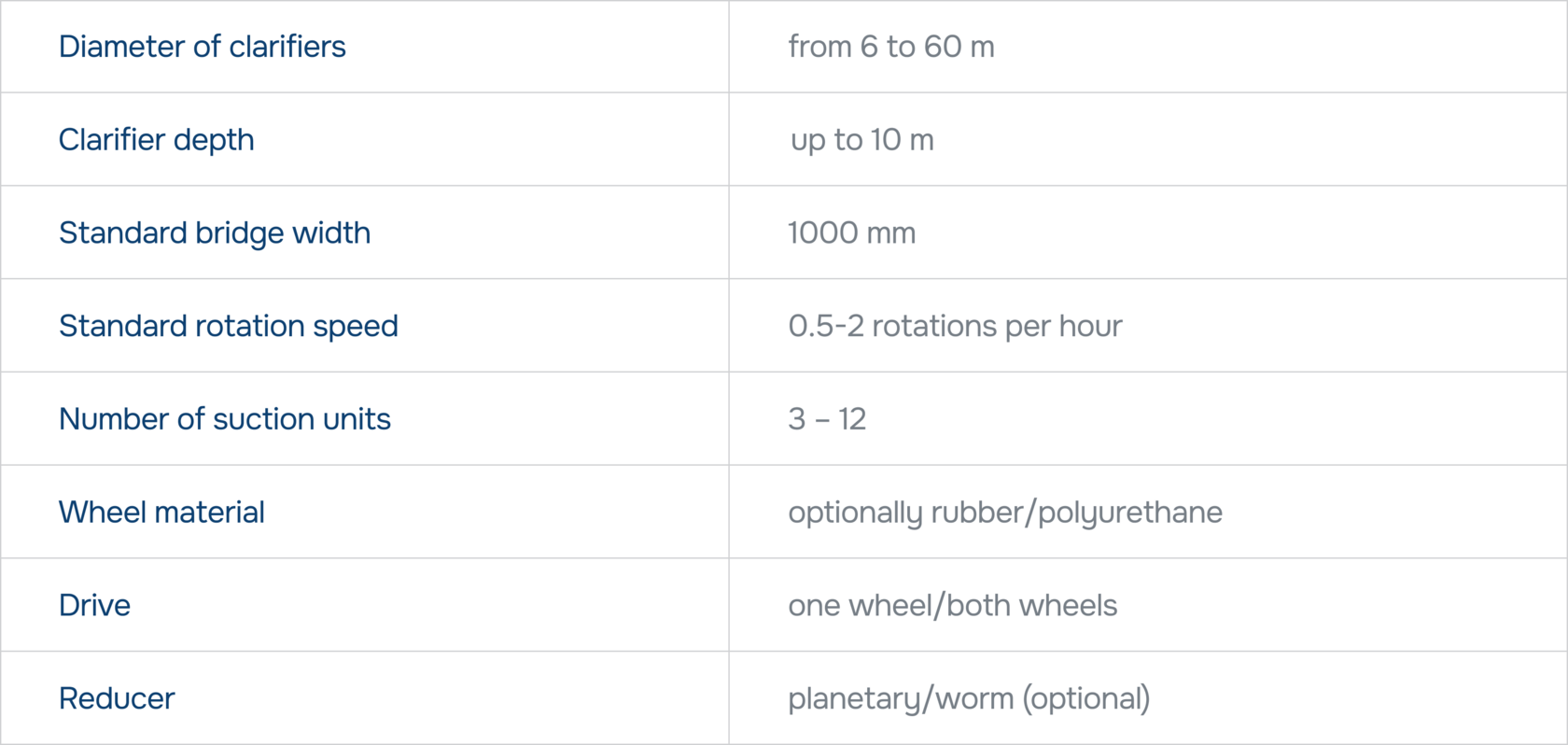 The operating model and performance of the sludge collector is adjustable over a wide range, well beyond the nominal parameters. To ensure uniform sludge collection over the entire radius of the settling tank, each sucker is equipped with adjusting diaphragms.