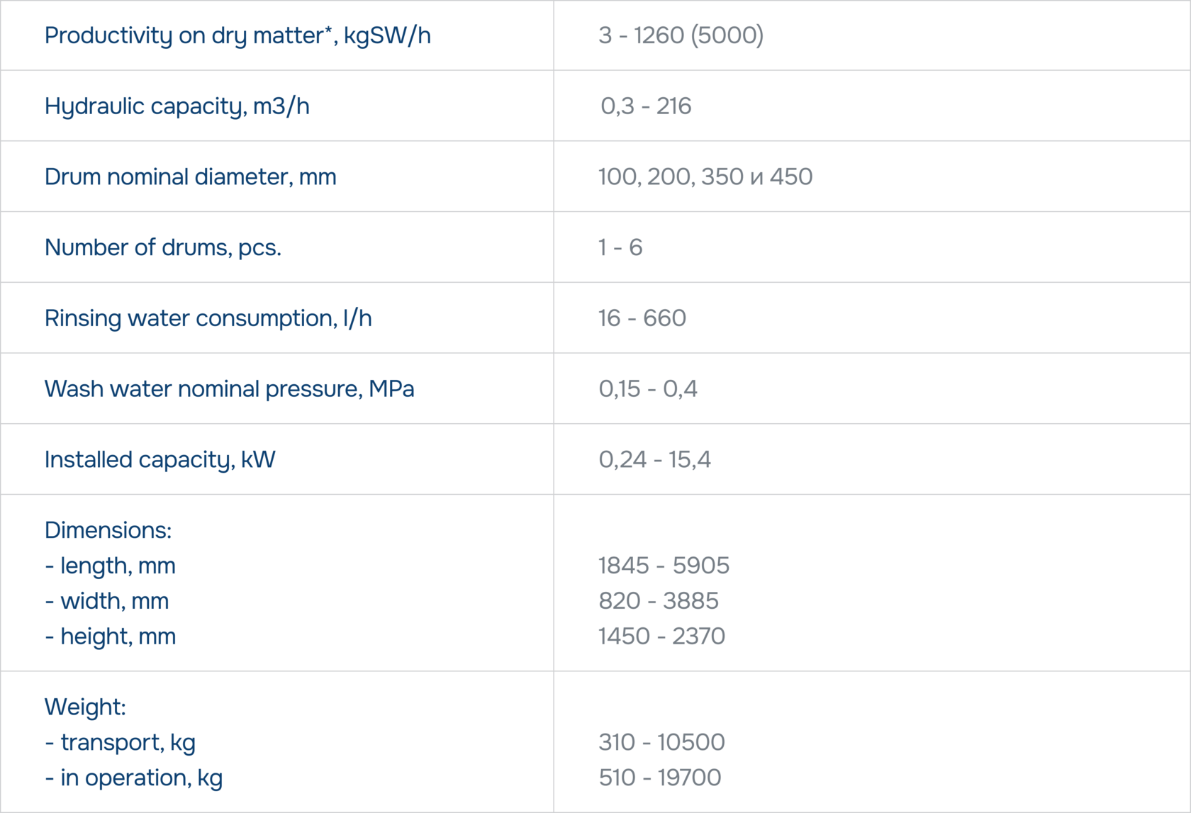 Energy efficiency and conservation. Thanks to the special screw design and the dehydrators operating functions, high energy efficiency, low consumption of reagents, and rinsing water are provided. A wide range of power and performance of manufactured models ensures optimal equipment for each project.