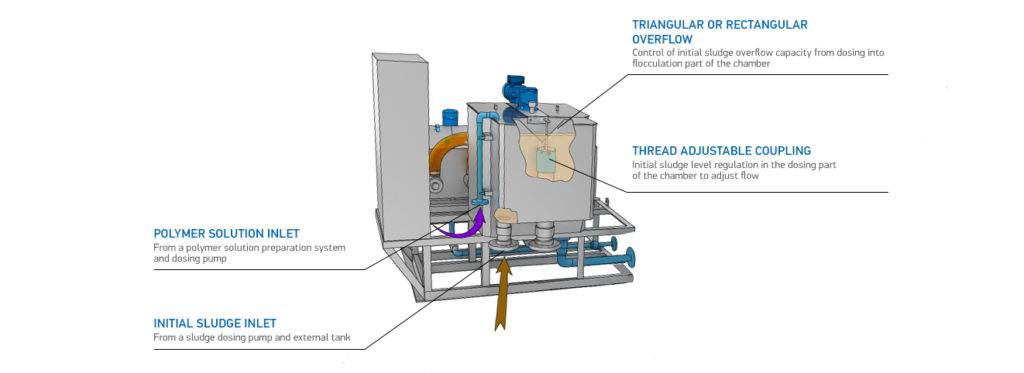 Low operating costs. The use of the screw drives with a low-rated power (up to 2.2 kW) and low speed controlled by frequency converters makes it possible to provide a minimum energy consumption. Low flocculant consumption is achieved by flocculant and sludge mixing speed regulation, visual control and subsequent consumption optimization.