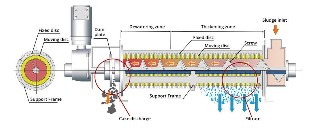 Minimal secondary filtrate contamination and ease of maintenance. The multi-disc dehydrator drum is a semi-closed construction, consisting of fixed and movable discs with the screw located inside, and rotating at a very low speed. During dewatering, the sludge does not splatter and the dry matter remains inside the cake. The dehydrator is an eco-friendly design that generates low noise and vibrations and emits no odors.