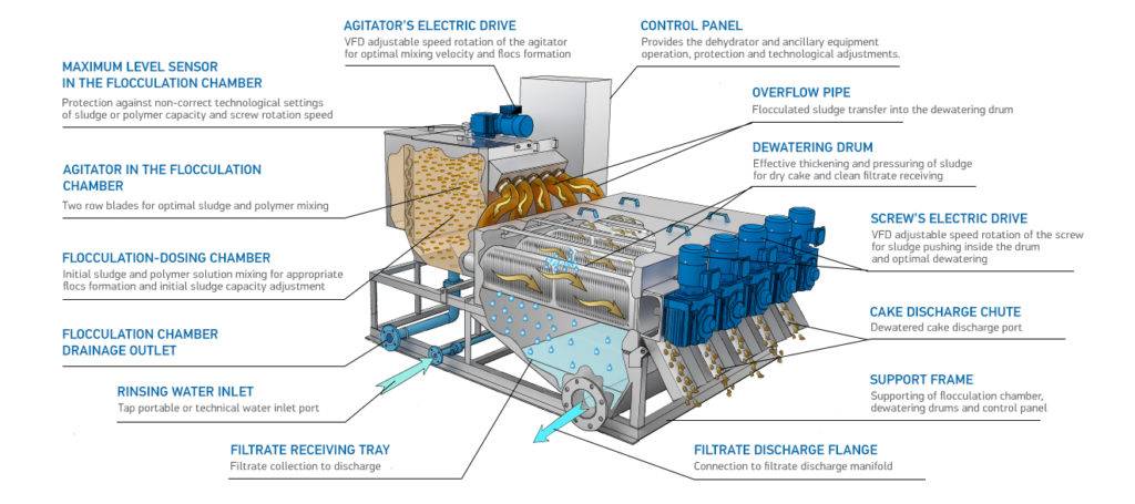 MDQ/MDQ-C screw press dehydrators depending on dewatered sludge properties and the installation conditions, customers can choose two main types of dehydrators.- The MDQ-XXX model with dewatering drums located above the internal sludge processing tank, including pumps for sludge feeding and mixing inside. The MDQ-XXX C model operates without internal tanks and pumps.