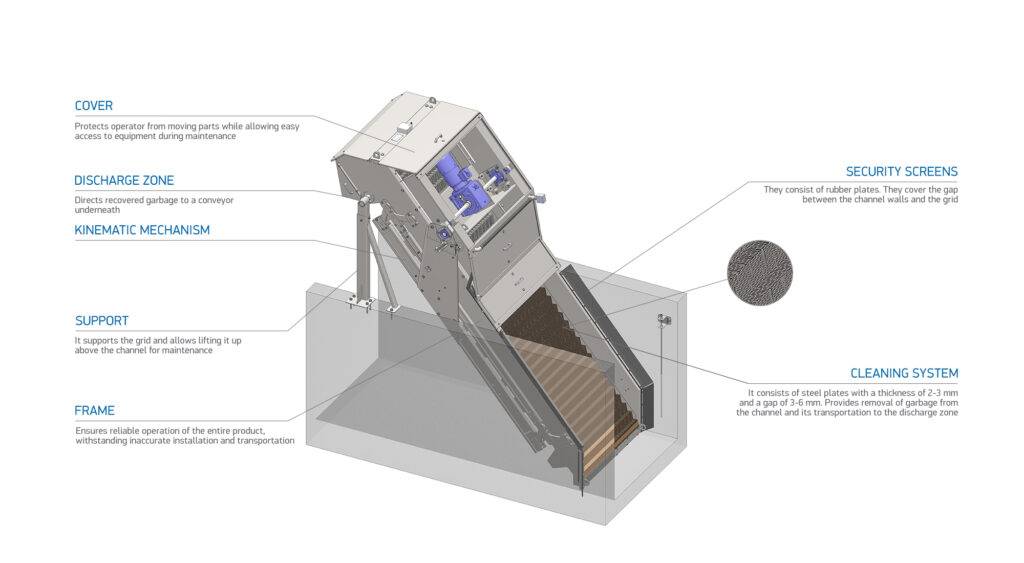 The main components of the equipment are available for external inspection and maintenance in operating condition. The screen is easily lifted above the channel. When replacement of the plates is required, their mounting design allows removing the plates one at a time without disassembling the entire screen.