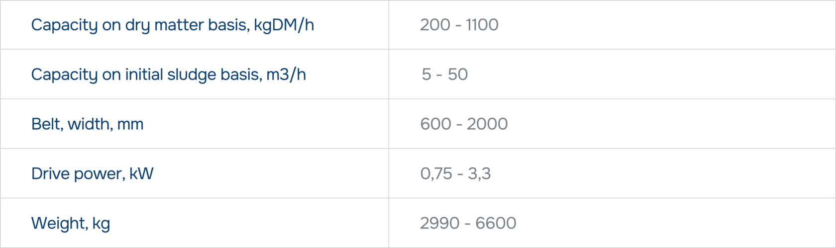 Energy efficiency and low consumption of flocculant. Belt filter press is characterized by low energy consumption and flocculant consumption. A wide range of power and capacity models allows to choose the optimal equipment for each project.