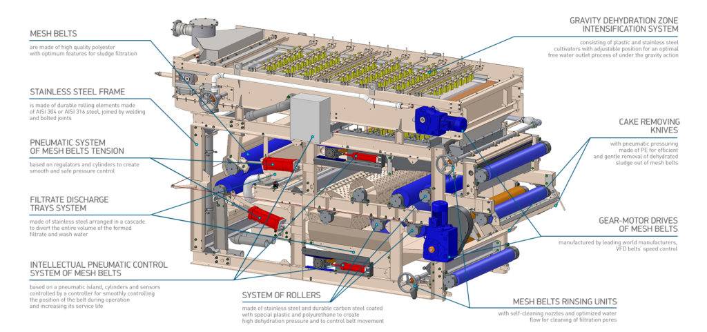 Ease of operation and maintenance. The use of high quality components and time-tested technical solutions ensures a long service life of the equipment and minimizes the need for maintenance. The belt filter press design allows visual control of the dewatering process, is convenient for preventive maintenance and replacement of wear parts. The main working units are easily accessible and their maintenance is performed using standard tools.