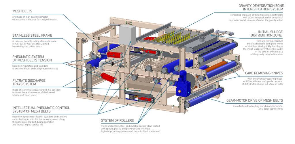 Reliability and durability. The main construction materials used for belt filter presses are stainless steel of AISI 304 or AISI 316 grades with additional treatment by pickling and passivation. Shafts are made of high-strength carbon steel with a significant safety margin and are coated (laminated) with wear-resistant RILSAN plastic. Produced filter presses are equipped with high quality electric motors, bearings, sensors and control system elements from well-known and reliable suppliers.