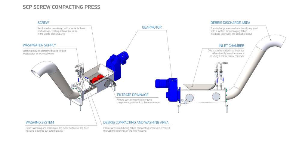 Various types of washing depending on the Customer’s needs: washing of the housing in the compacting zone and in the screenings loading zone, organic matter washing out of screenings.